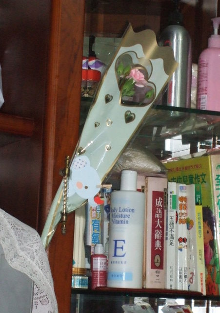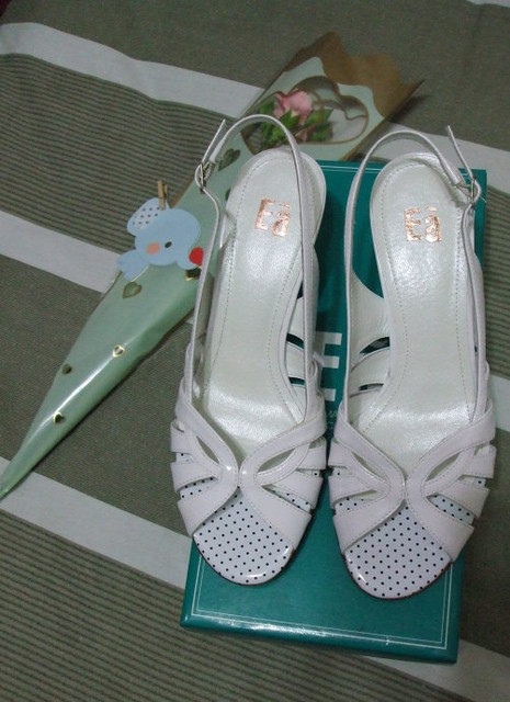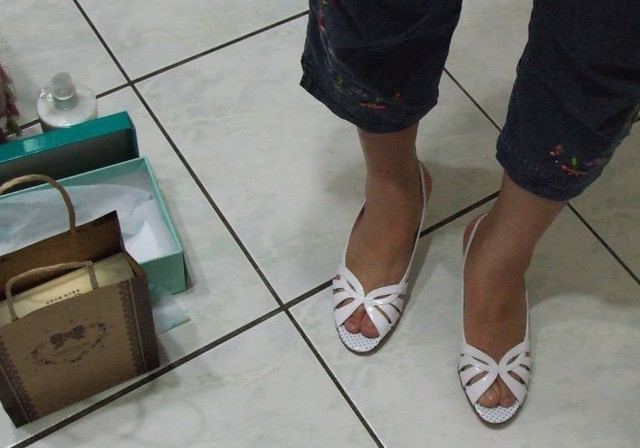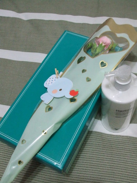 妹妹送老媽的身體乳液、我挑的白色高跟涼鞋、外加老妹男友提供的貼心禮物。